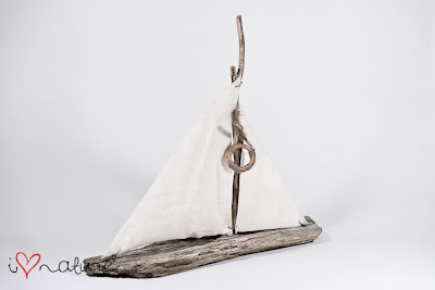 Trzeci - "Sailboat" Żaglówka wykonana z kawałka drewna, gałązki oraz materiału typu surówka. Podstawa stateczku oryginalnie posiadała dziurę, w której wcześniej był sęk a więc wykorzystałam materiał bez ingerencji w jego strukturę. Koło ratunkowe wykonanałam z drewna jesionowego i zgrzebnego sznurka i zawiesiłam na odstającej z masztu gałązce.Oczka przytrzymujące żagle wykonałam z druciku, przez które przewlekłam dratwę która napięta utrzymuje kształt materiałowych żagli.
